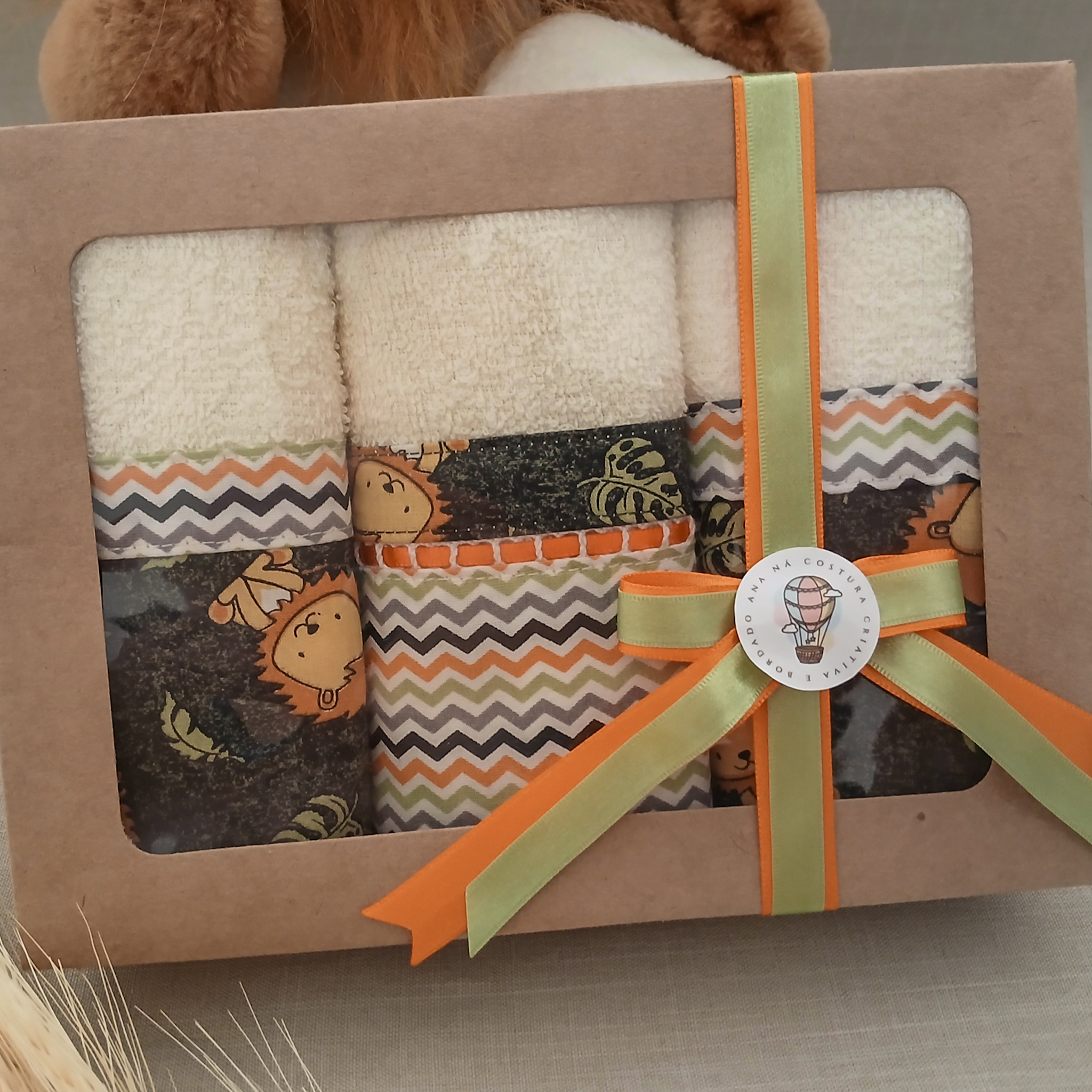 O kit é composto por 3 toalhas acondicionadas em uma caixinha de papelão kraft com visor transparente, fechada com fita de cetim e laço duplo.