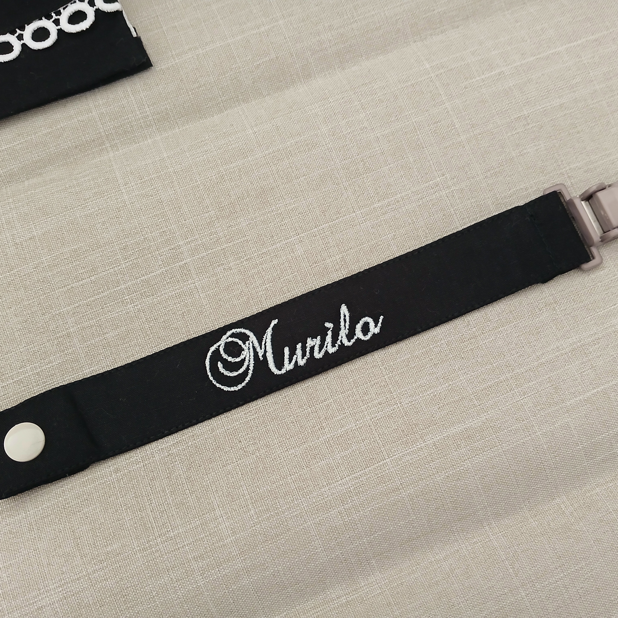 O prendedor de chupeta é confeccionado em tecido 100% algodão.