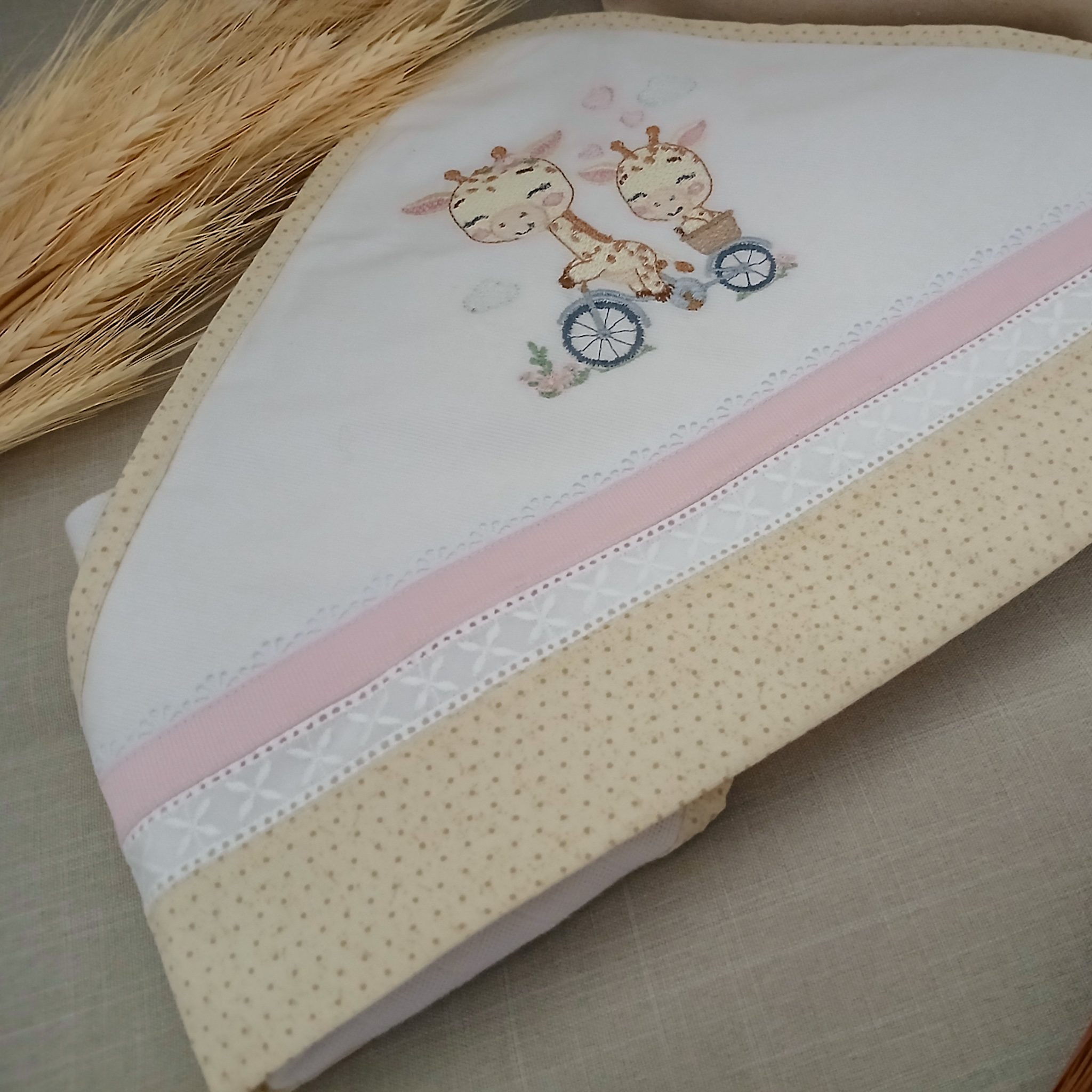 Produzida com fralda de ótima qualidade (Mabber); capuz confeccionado com tecido de algodão e forro de fralda, evita que o bordado entre em contato direto com a pele do bebê.